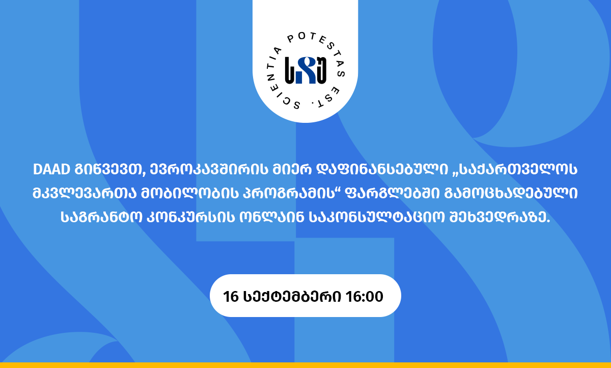 გერმანიის აკადემიური გაცვლის სამსახურის (DAAD) საქართველოს რეგიონული ოფისი ევროკავშირის მიერ დაფინანსებული „საქართველოს მკვლევართა მობილობის პროგრამის“ ფარგლებში 2022 წლის 16 სექტემბერს 16:00 საათზე გიწვევთ ევროკავშირის მიერ დაფინანსებული „საქართველოს მკვლევართა მობილობის პროგრამის“ ფარგლებში გამოცხადებული საგრანტო კონკურსის ონლაინ საკონსულტაციო შეხვედრაზე.